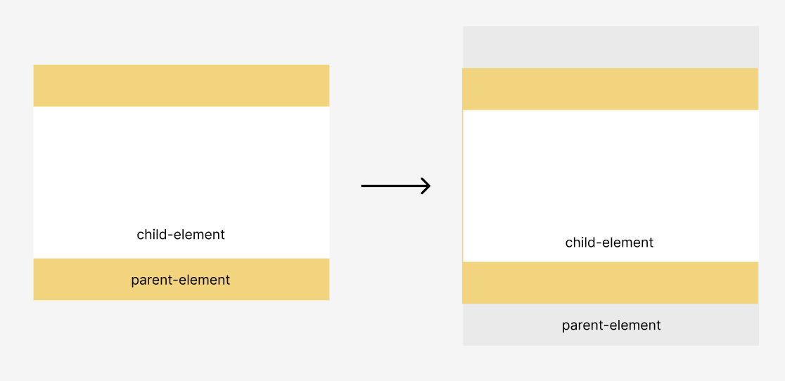부모 블록에 border, padding, inline 요소가 없고, 부모의 margin-top, margin-bottom 을 자손의 margin-top 또는 margin-bottom과 분리할 권한이 없는 경우 부모와 자손의 마진이 병합된다. 병합된 마진은 부모 블록 바깥에 위치한다.