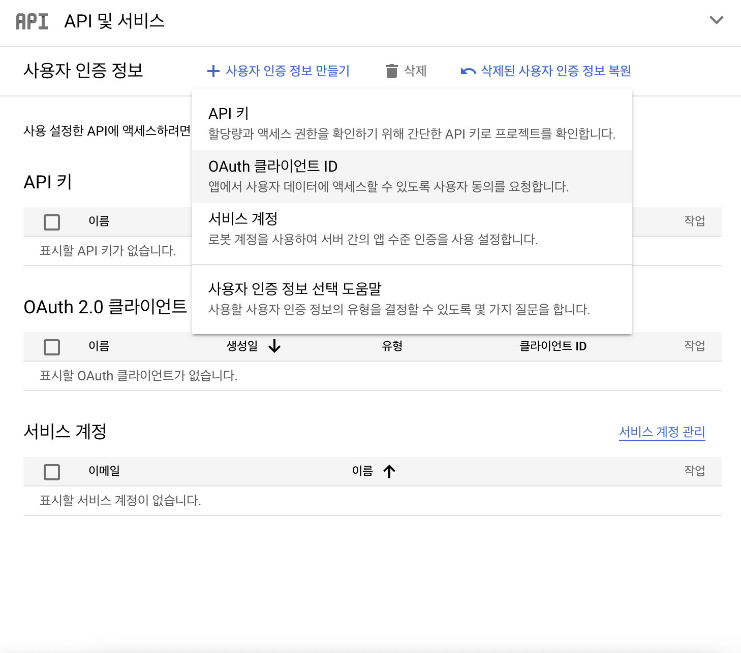 사용자 인증 정보 만들기를 선택하고 OAuth Client ID를 생성한다.