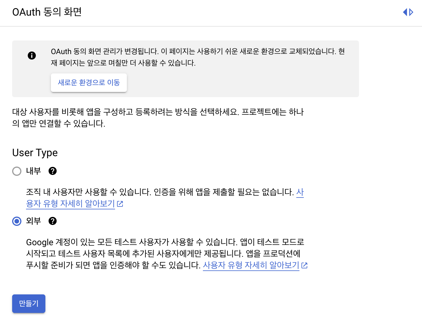 User Type은 외부로 설정하고, 나머지 OAuth 동의 화면은 필수 입력값만 입력한다.