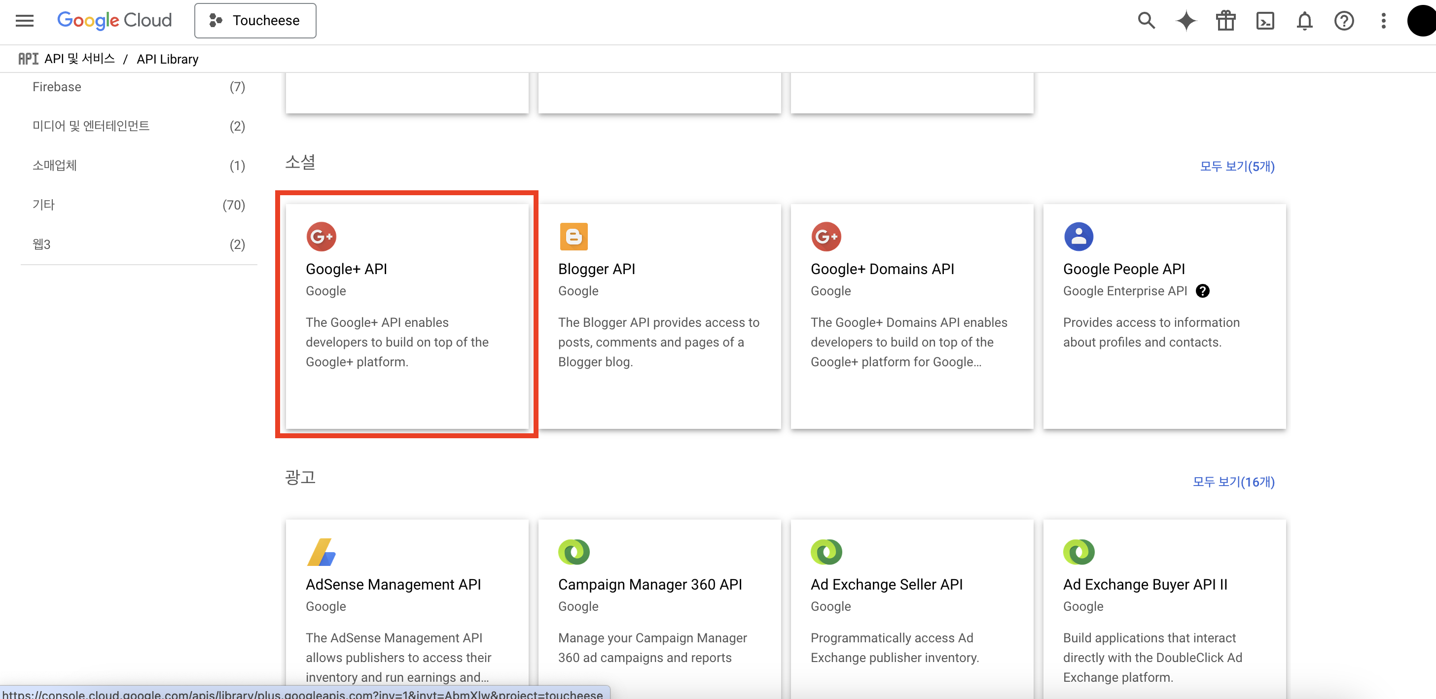 이 과정을 놓치기 쉬운데, API 라이브러리 탭으로 이동하여 Google+ API를 반드시 추가해야 한다!