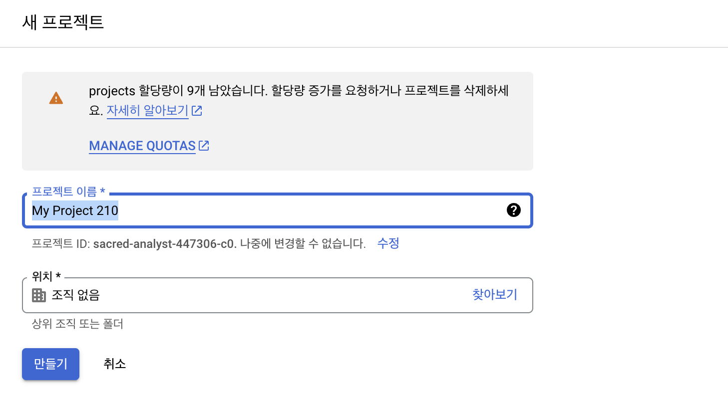 구글 클라우드 콘솔에 접속해서 새 프로젝트를 생성한다.