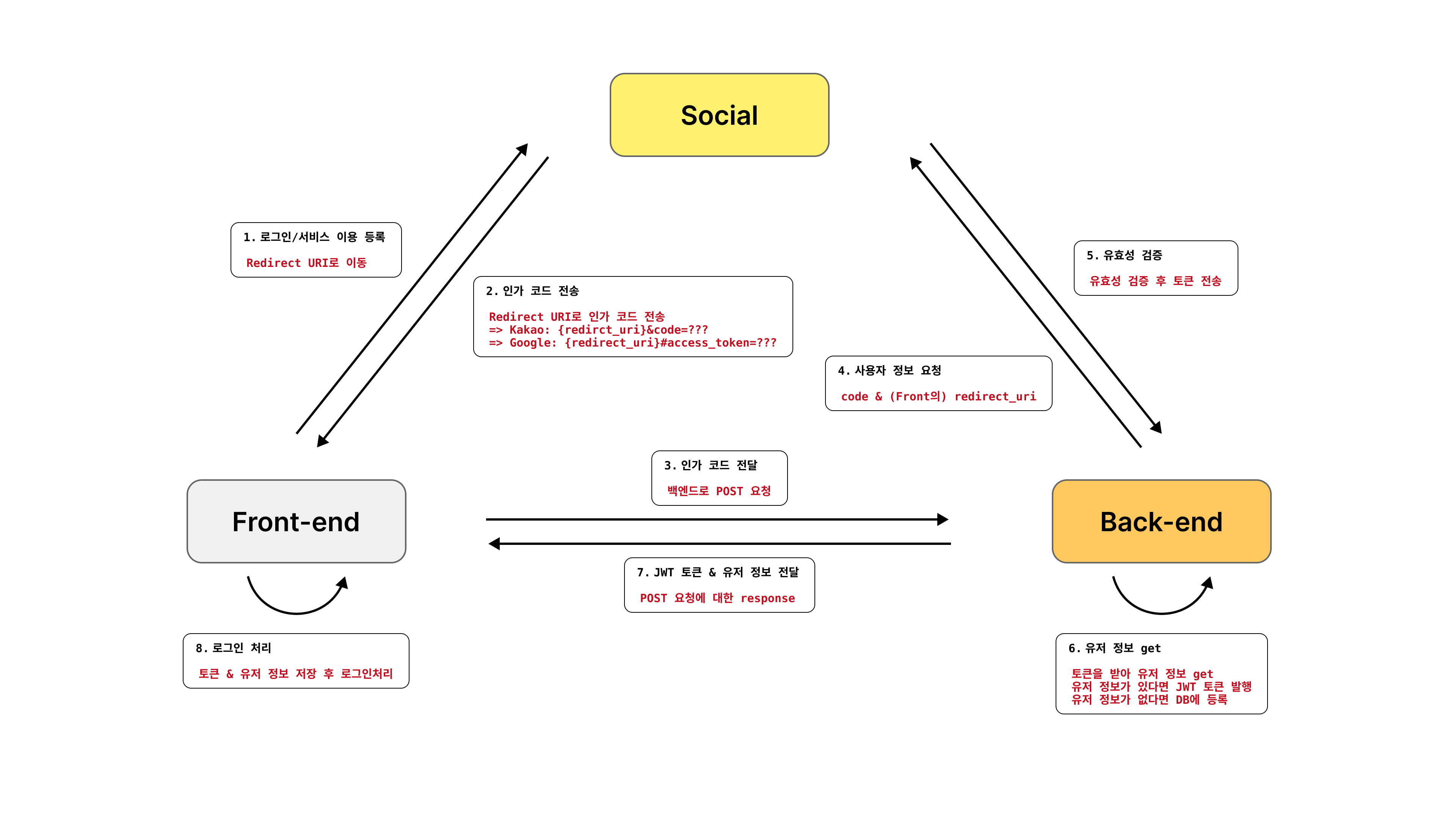 구글이든 카카오든 소셜 로그인 과정은 거의 유사하다. 처음 마주치면 이해도 안 되고 어려운 내용들인 것 같은데 딱 한 번만 이해하면 특히 Front-end 파트에서는 어려움이 없을 듯하다. 위의 다이어그램을 함께 확인하면 이해가 조금 더 쉬울 것이다. 내가 그랬다!