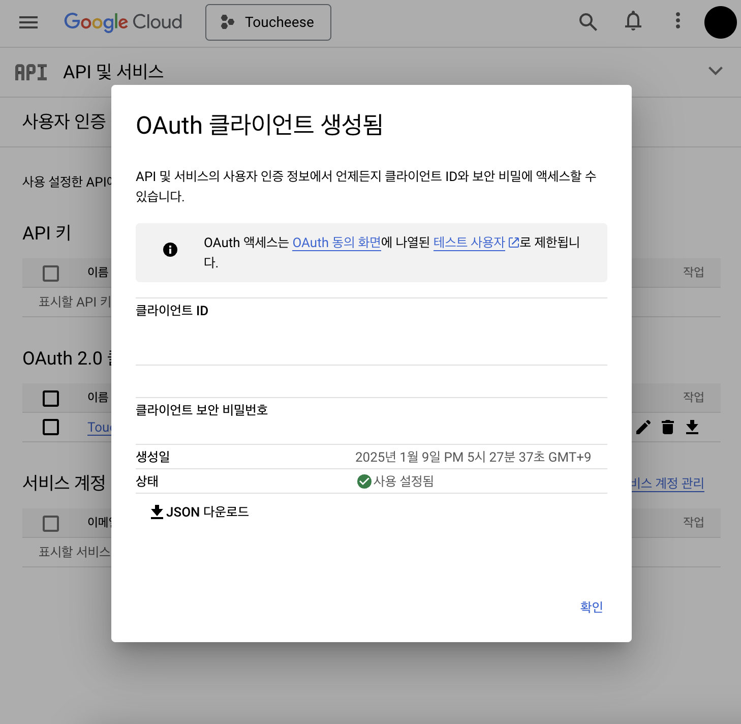 완료하면 OAuth Client ID가 발급된다.