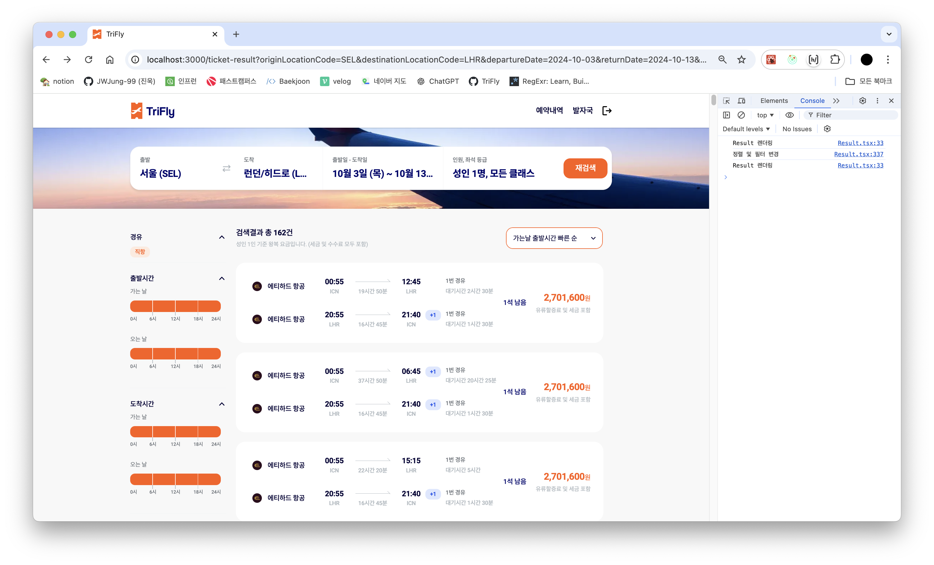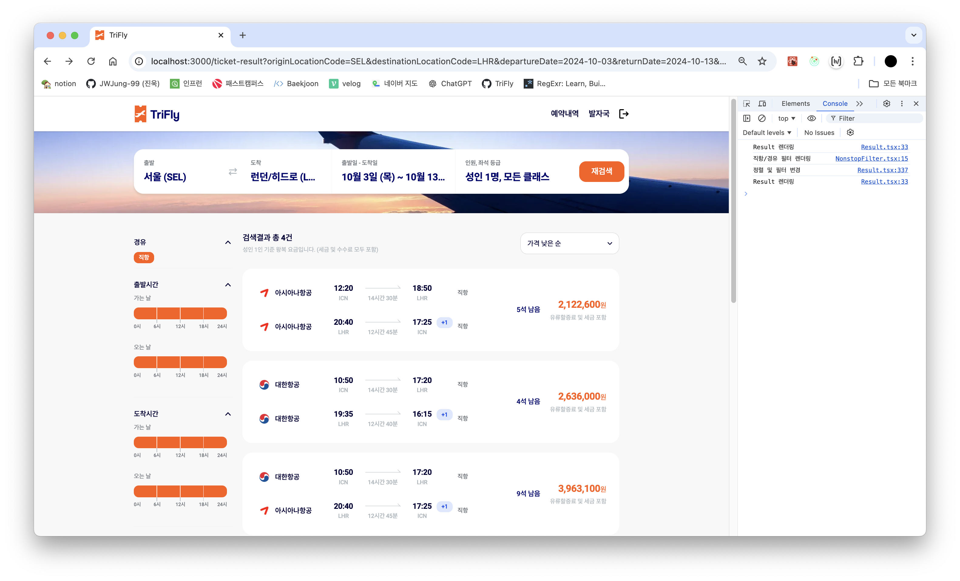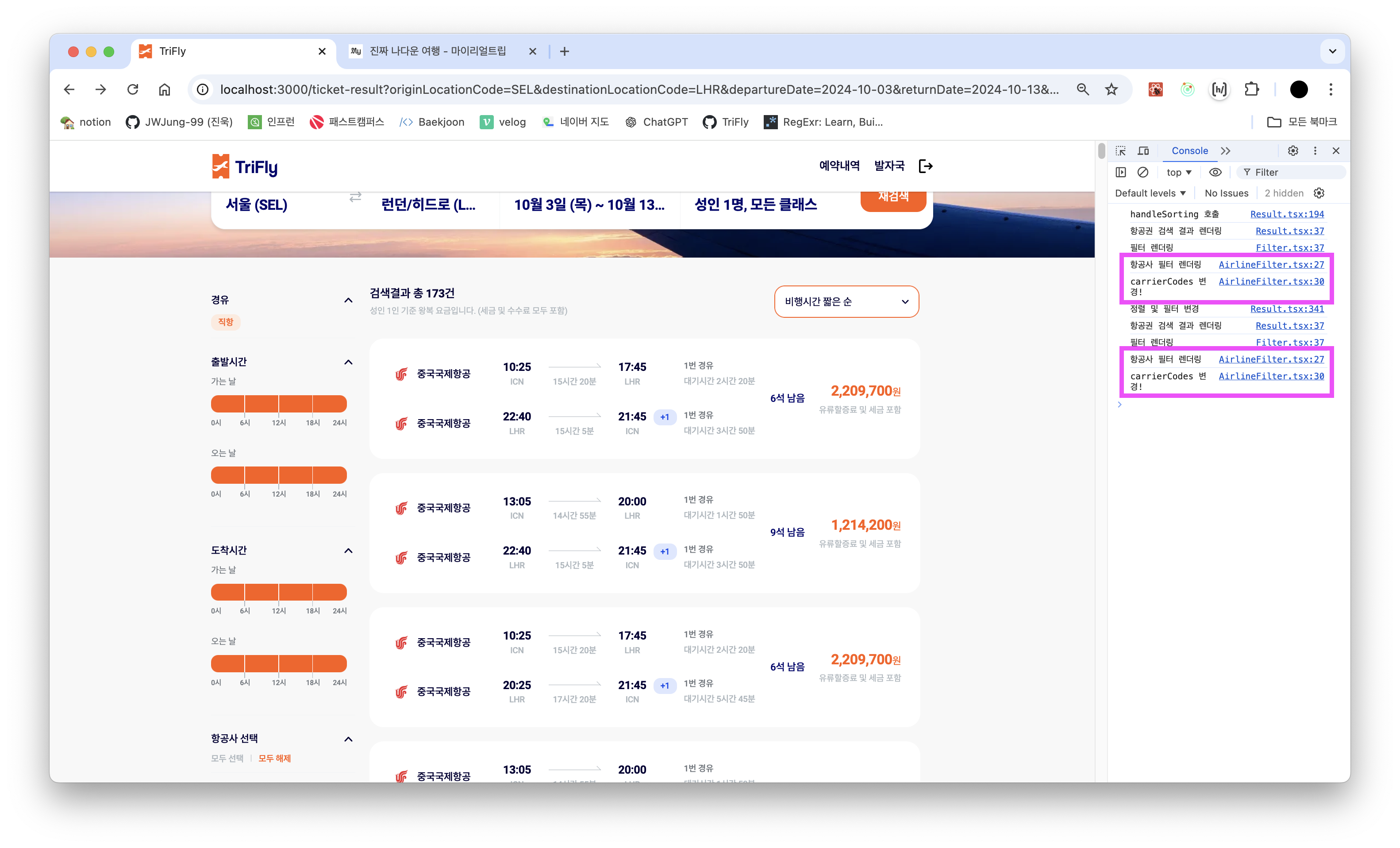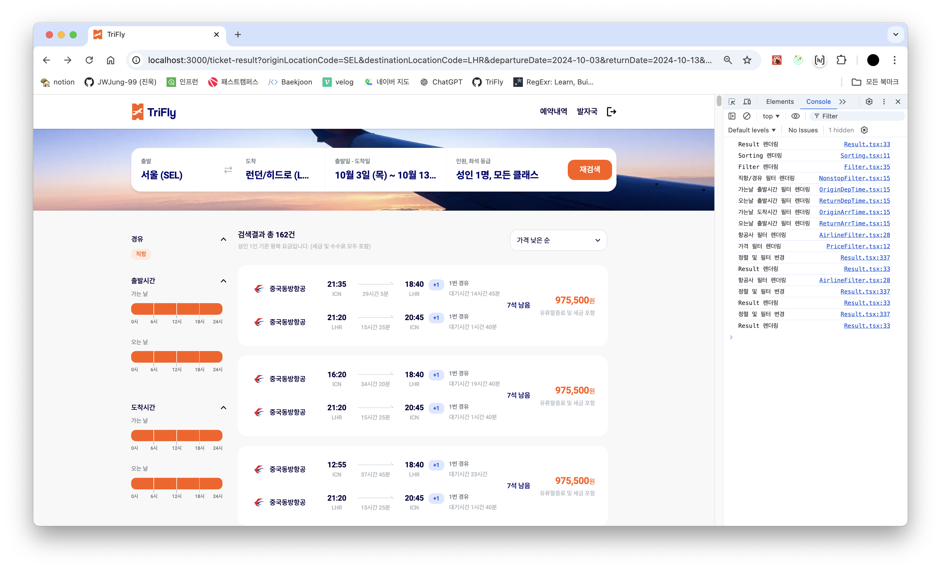 초기 렌더링 시 Result 컴포넌트, Sorting 컴포넌트, Filter 컴포넌트가 차례로 렌더링되며 setter가 있는 항공사 필터, 가격 필터로 인해 렌더링이 한 번씩 더 발생하게 된다.