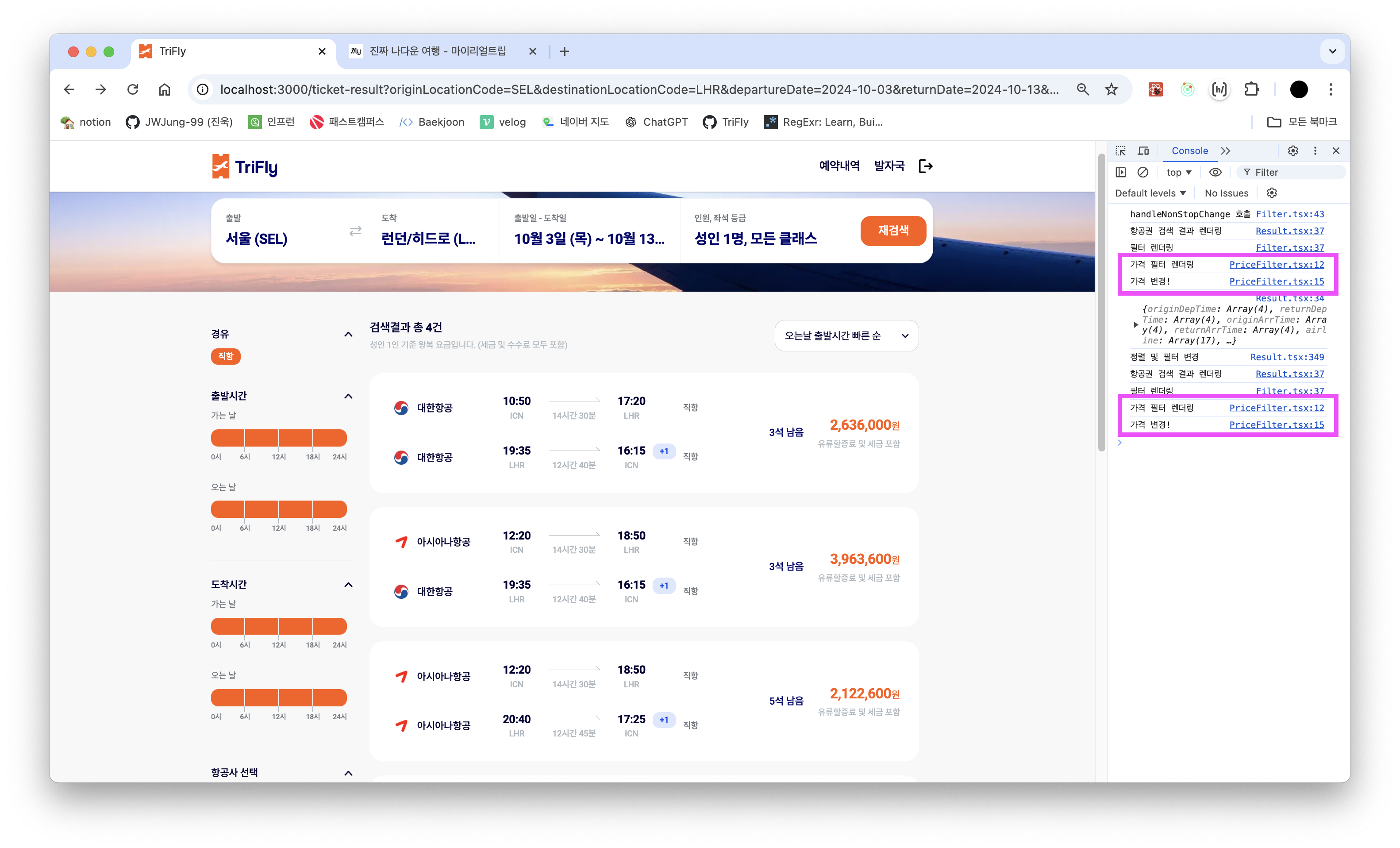 문제는 그런데도 항공사 필터를 변경할 때, 가격을 변경할 때 다음과 같이 렌더링이 발생하는 것이었다....