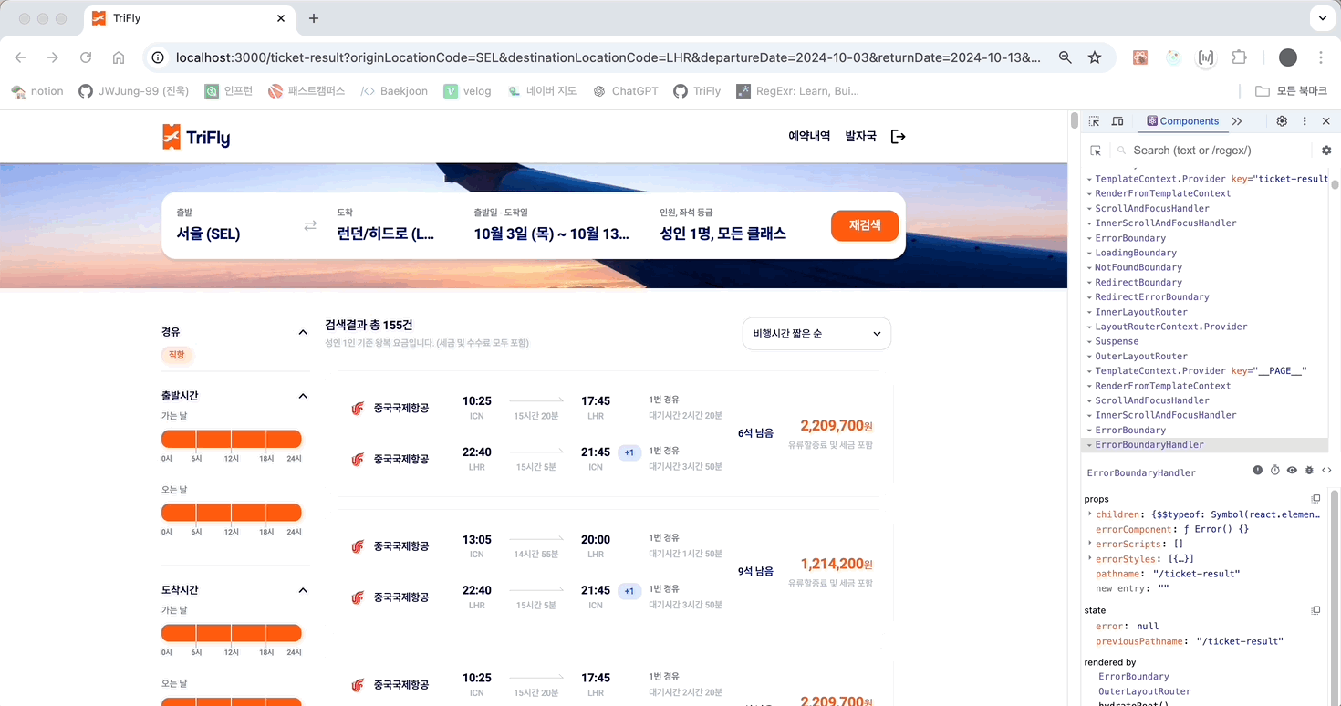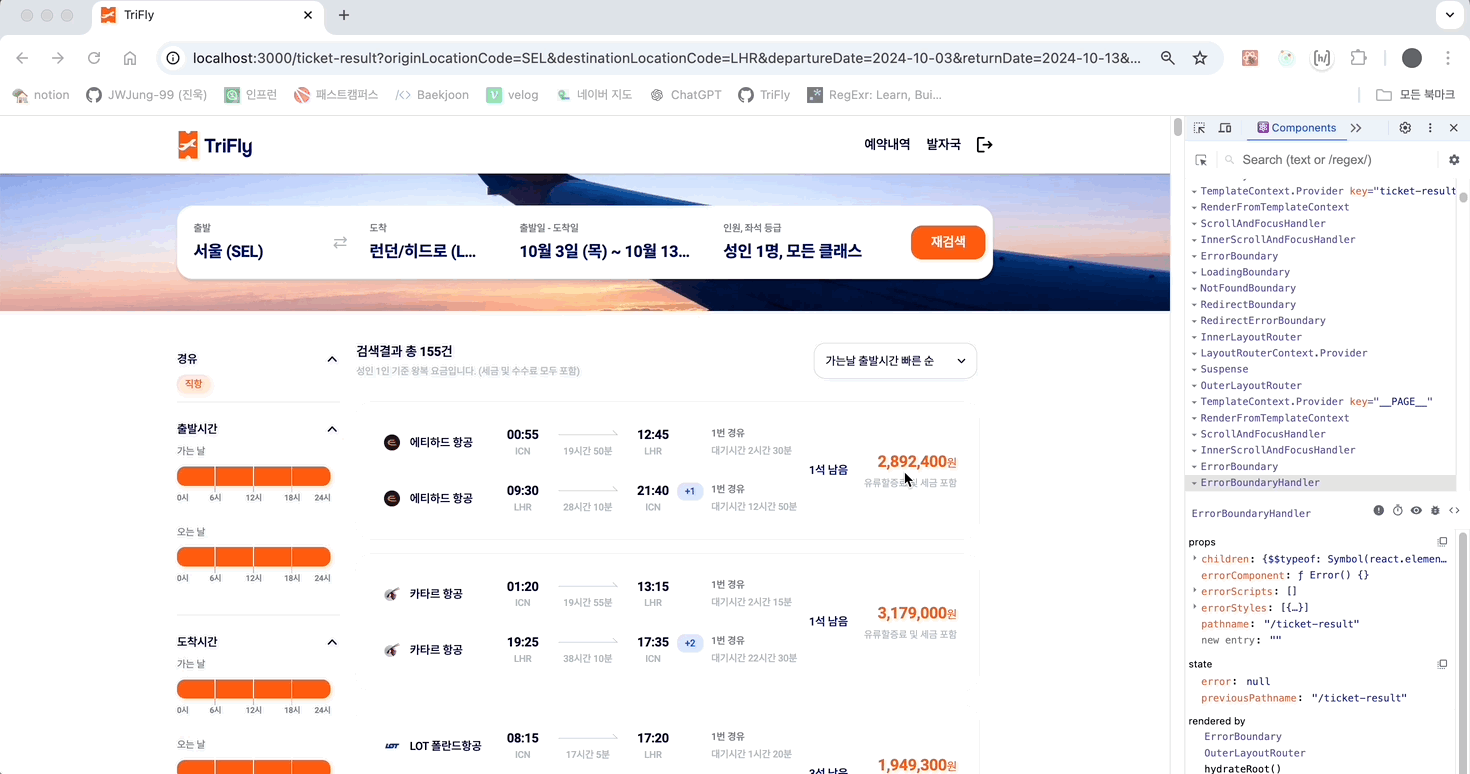 필터 변경 시에도 변경된 해당 필터만 다시 렌더링되고 항공권 검색 결과를 제외한 나머지 컴포넌트들은 렌더링되지 않도록 하였다.
