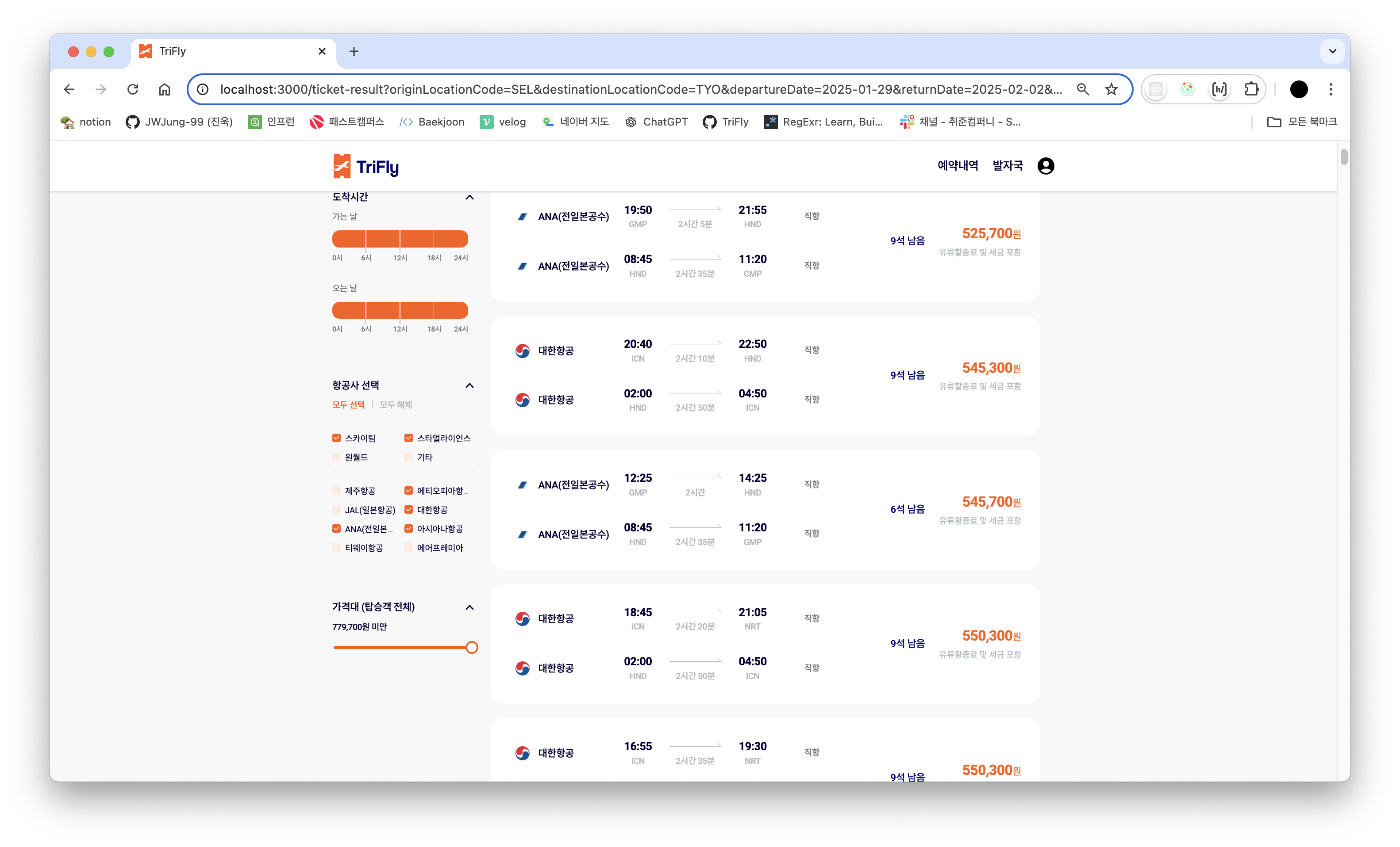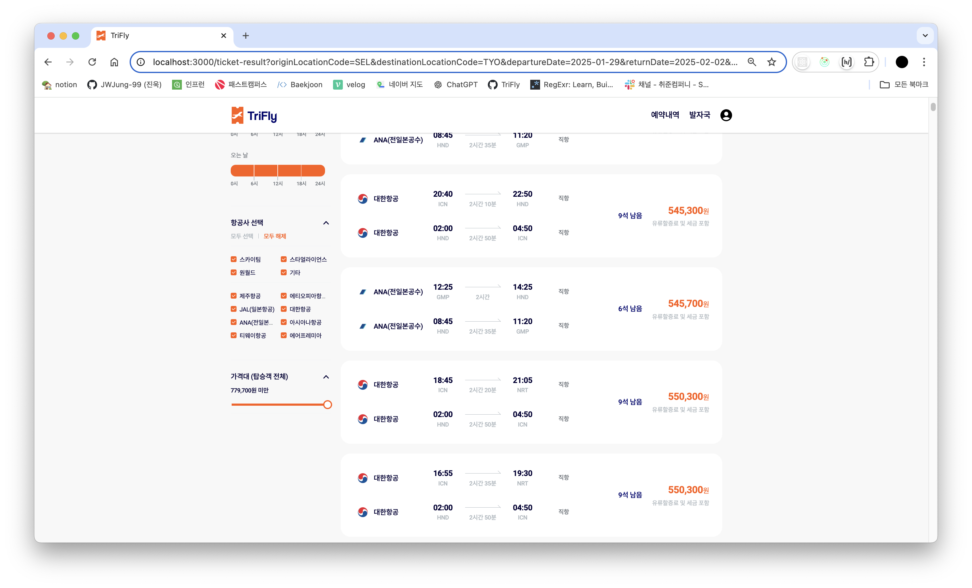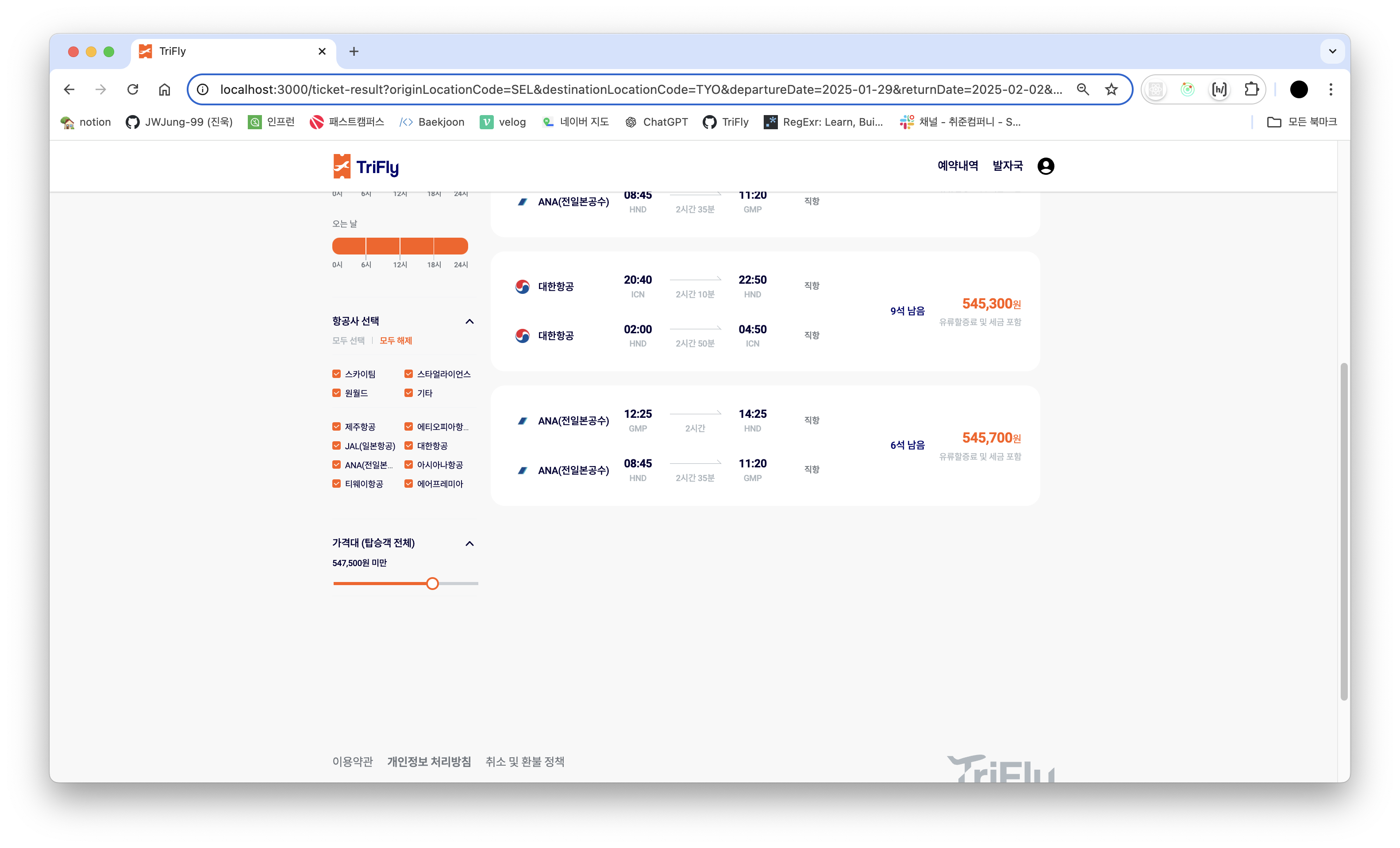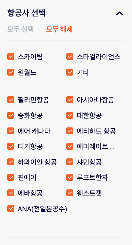 항공사 필터 부분이 구현에서 가장 어려웠던 요소인 것 같다. 모두선택/모두해제 버튼을 구현하였고 각 동맹체를 체크하면 그에 해당하는 항공사들이 선택 또는 취소되도록 하였다. 물론 항공사 하나하나 선택도 가능하다.