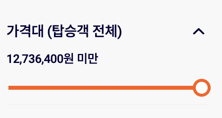 가격 필터는 발자국 페이지의 항공권 꾸미기에 사용되는 펜 두께 설정 슬라이드를 공통으로 사용하여 구현하였다. 처음 개발 시에는 탑승객 전체 가격대라는 명시도 없었고, 가장 중요한 부분인 가격 표시 부분에서 검색 결과 중 최고가를 보여준 것이 아니라 임의로 설정한 가격을 보여주는 문제가 있었지만 QA와 리팩토링 과정을 거치며 최고가를 보여줄 수 있게 수정할 수 있었다.