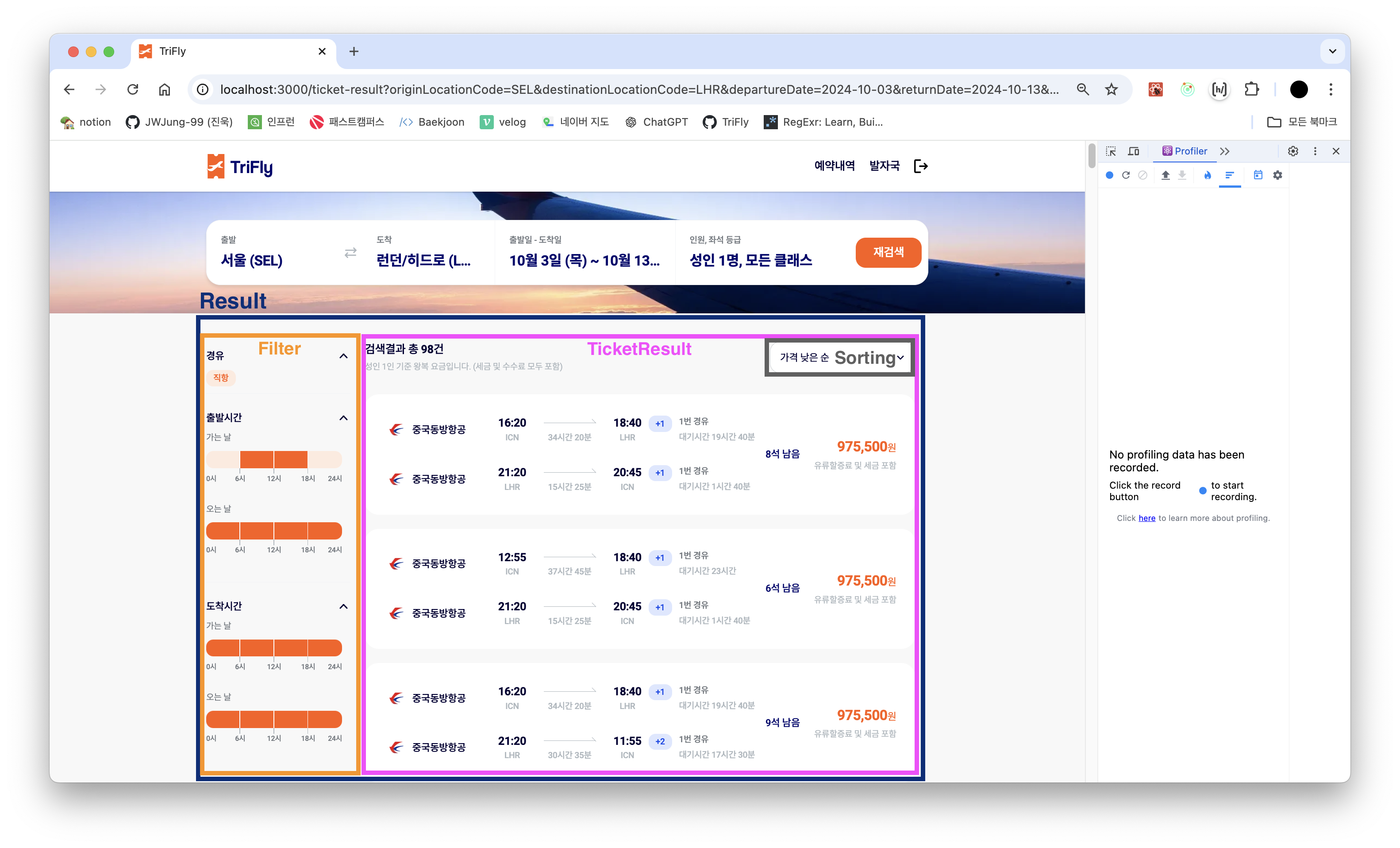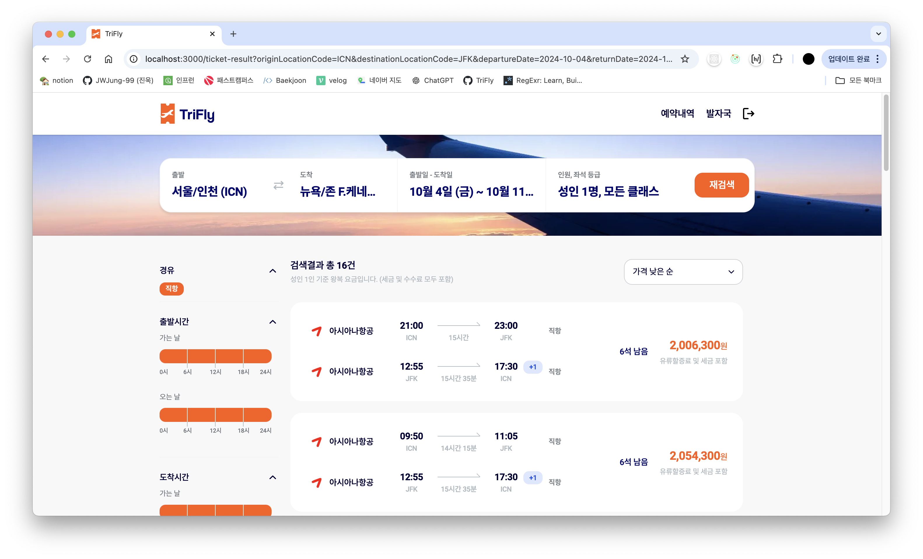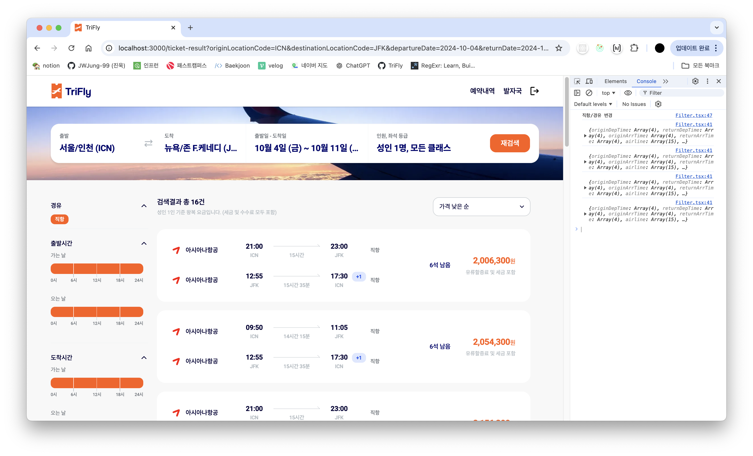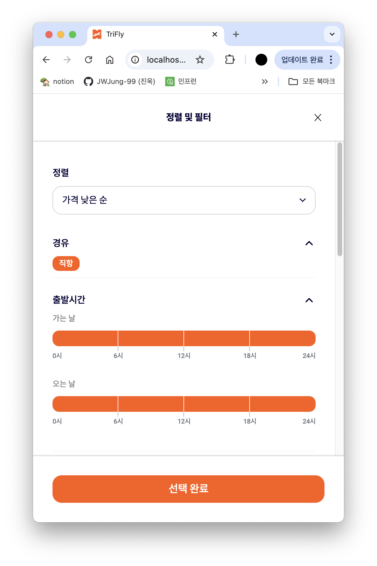 항공권 검색 후 사용자가 설정한 조건(직항, 출발시간, 도착시간, 항공사, 가격대)에 따라 원하는 검색 결과를 확인할 수 있는 필터를 구현하였다. 또한 사용자가 선택한 기준에 맞게 검색 결과를 정렬하는 기능도 추가하였다.