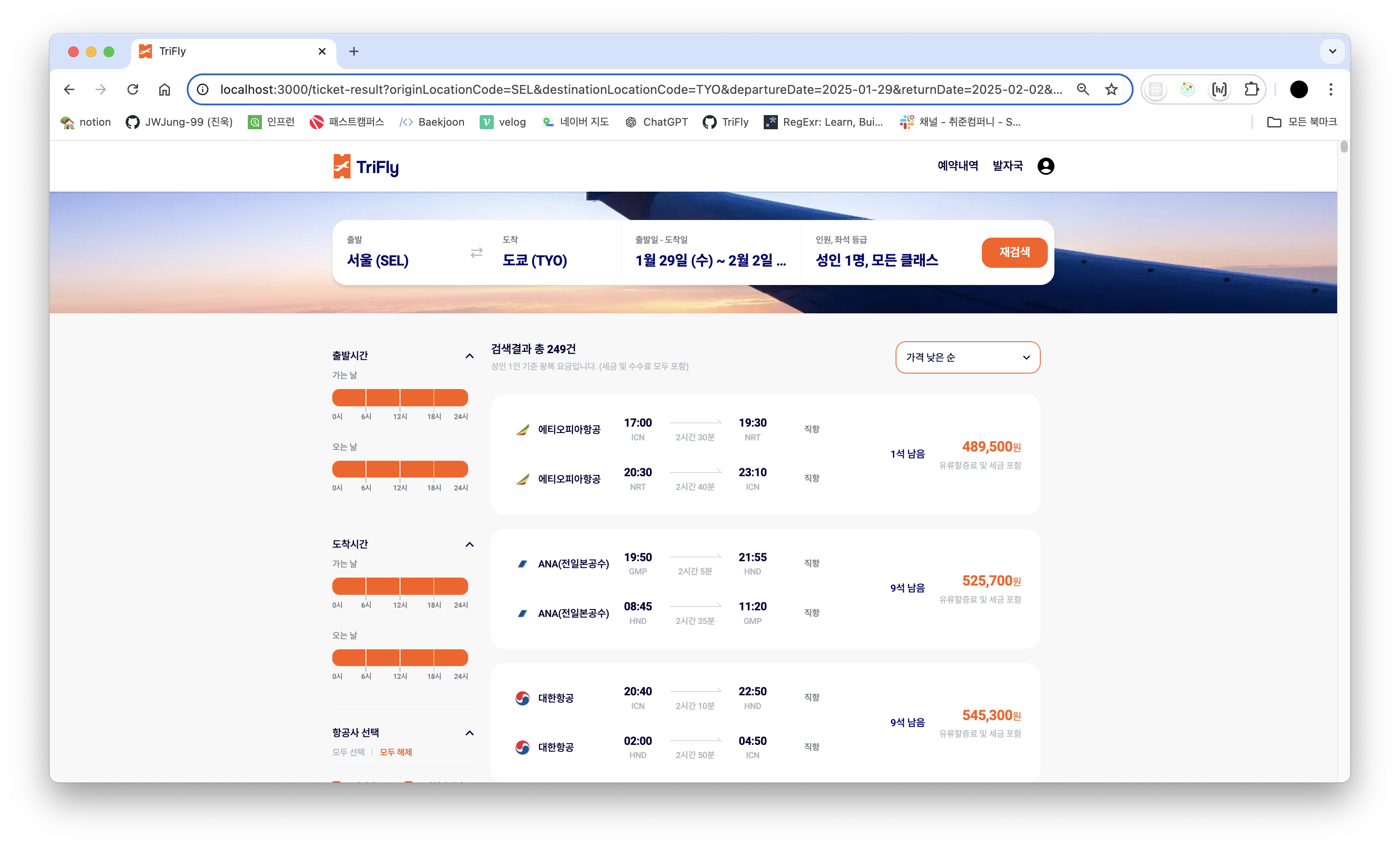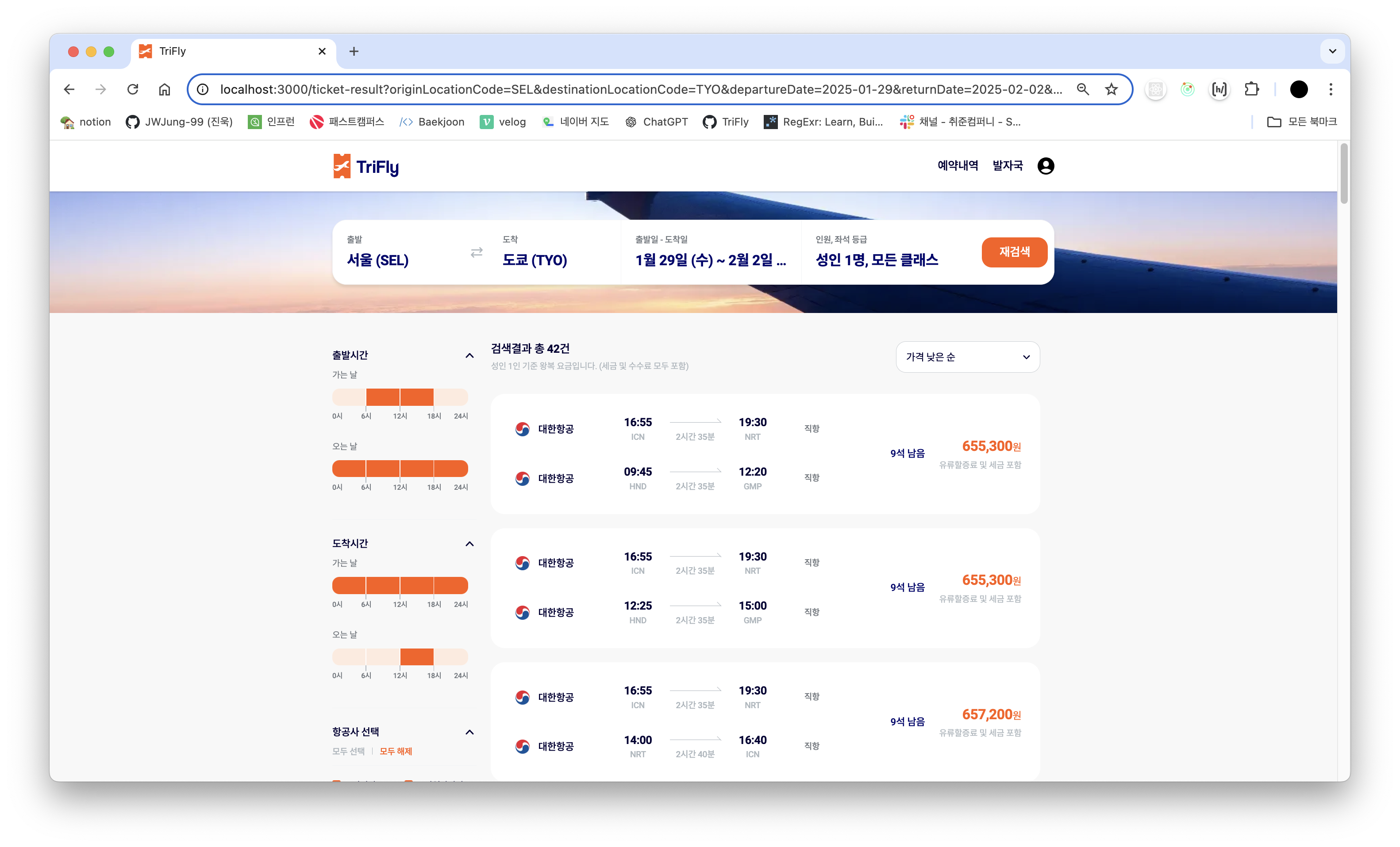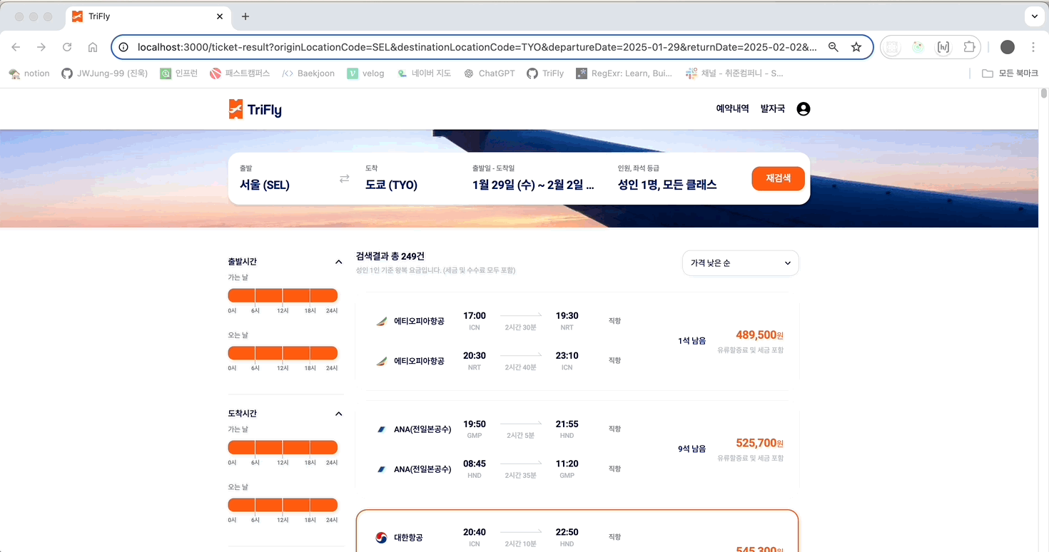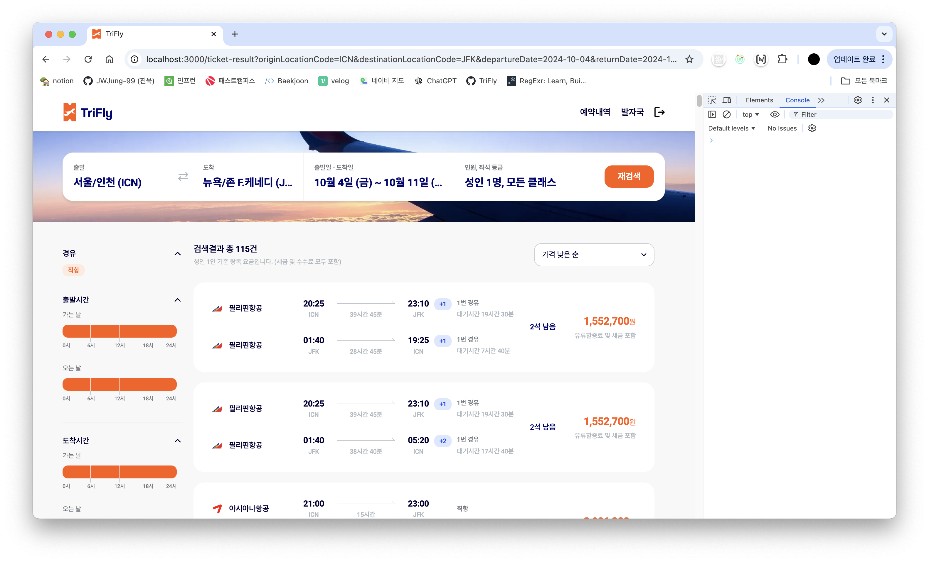 항공권 검색 후 사용자가 설정한 조건(직항, 출발시간, 도착시간, 항공사, 가격대)에 따라 원하는 검색 결과를 확인할 수 있는 필터를 구현하였다. 또한 사용자가 선택한 기준에 맞게 검색 결과를 정렬하는 기능도 추가하였다.
