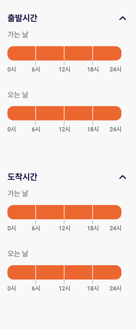 처음에 디자인 시안을 보고 "어 어떡하지 CSS 덩어리다"라고 생각했지만 이번 프로젝트를 진행하며 익숙해진 덕분인지 생각보다 구현하는 것이 어렵지는 않았던 출/도착시간 필터이다. checkbox 타입의 input 요소를 활용하였으며 각 선택 영역은 label을 이용하여 설계하였다. 시간대별 눈금은 시간 범주 요소에 ::after 가상 요소를 활용하여 추가하였다.