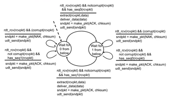 1이나 0을 대기할때 다른 시퀀스가 오는 이유 : 다른 시퀀스로 넘어가면서 ack를 보내는데 이게 sender에서 corrupt될 경우 재전송 하기 떄문