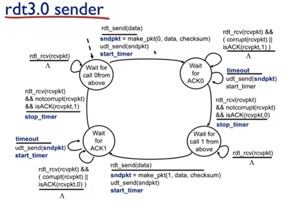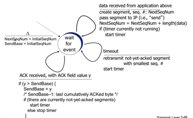 - sender : app layer에서 데이터 받기, 패킷 만들고 전송, 다시 상태 유지