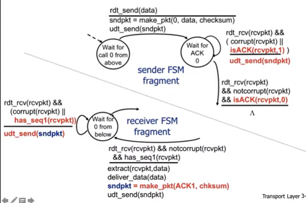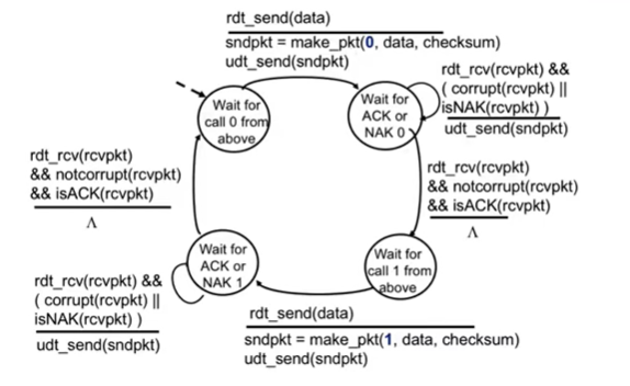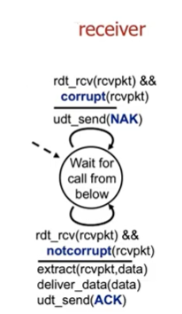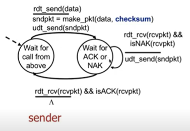 receiver : 페킷을 받으면 checksum확인 다르면 nak보내고 다시 대기 맞으면 ack보내고 app layer로 데이터 전송