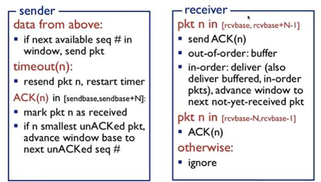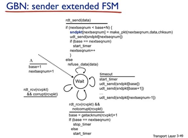 - 이때 베이스가 다음 페킷 번호와 같으면(모든 ack를 받음) 타이머 멈춤, 다르면 차이머 재시작