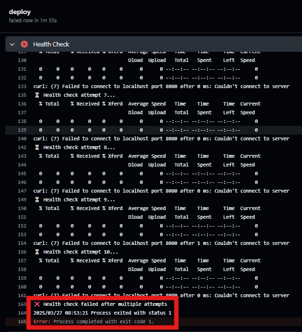 ๋ฐฐํฌ๋ ์ฑ๊ณต์ ์ผ๋ก ์๋ฃ๋์์ง๋ง, health check๋ ๊ณ์ํด์ ์คํจํ๋ ๋ฌธ์ ๊ฐ ๋ฐ์ํ๋ค. ๋ฐ๋ผ์ ์ฌ๋ฌ๊ฐ์ง ๊ฐ๋ฅ์ฑ์ ์ฒดํฌํด๋ณด๋ฉฐ ๋ฌธ์ ๋ฅผ ํด๊ฒฐํ๋ค.