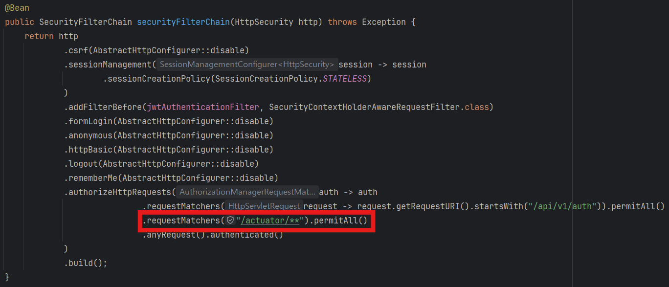 ๋, SecurityConfig ํด๋์ค์์ actuator ๊ฒฝ๋ก๋ ํ์ฉํด์ผ ํ๋ค.