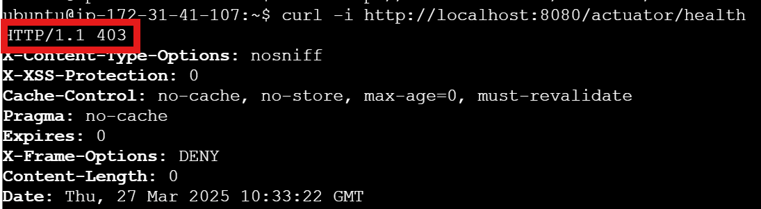 ๋ น์ด๋ฅผ ์คํํ์ ๋ ์๋์ฒ๋ผ 403 Forbidden ์๋ต์ด ์ค๋ฉด, actuator endpoint๋ ์ด๋ ค ์์ผ๋ ์ ๊ทผ ๊ถํ์ด ๋งํ ์๋ค๋ ๋ป์ด๋ค.