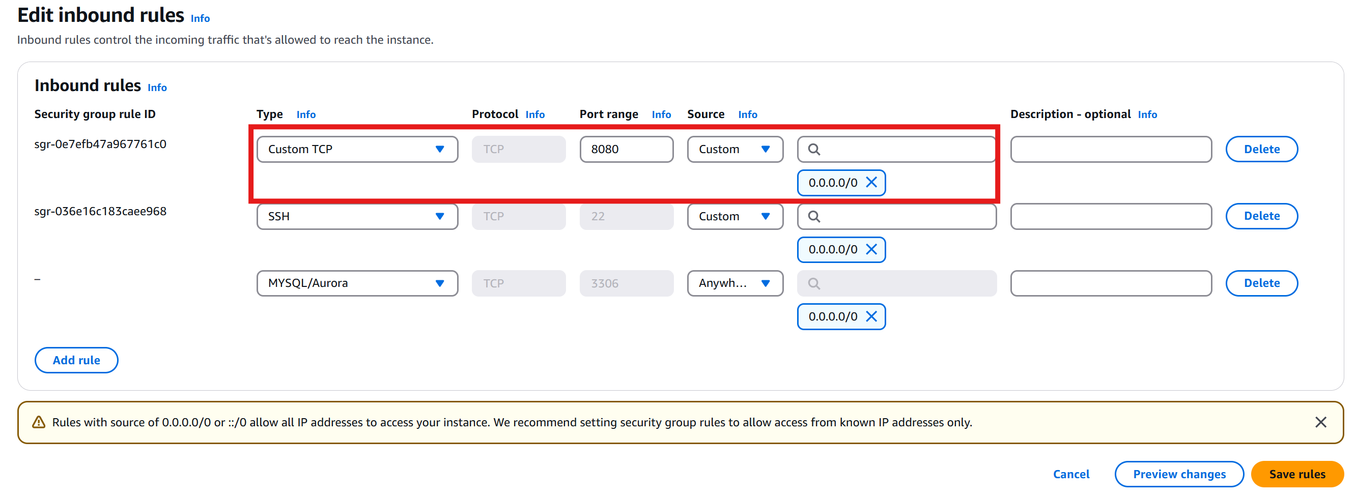EC2 ๋ด๋ถ์์๋ health ์๋ต์ด ์ ์ค๋๋ฐ๋ ์ธ๋ถ health check๊ฐ ์คํจํ๋ค๋ฉด, EC2 ๋ณด์ ๊ทธ๋ฃน ์ค์ ์ ์ ๊ฒํด์ผ ํ๋ค. AWS๋ฅผ ์ฌ์ฉํ ๋๋ ํนํ๋ ๋ณด์ ๊ทธ๋ฃน ์ค์ ๋ฌธ์ ์ธ ๊ฒฝ์ฐ๊ฐ ๋ง์ผ๋ ์ ํ์ธํด๋๋ ๊ฒ์ด ์ข๋ค. ํฌํธ 8080์ด ํผ๋ธ๋ฆญ์ผ๋ก ์ด๋ ค ์์ด์ผ ์ธ๋ถ์์ ์ ๊ทผ ๊ฐ๋ฅํ๋ค.