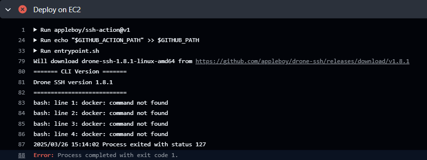 docker: command not found ์๋ฌ๋ EC2 ์๋ฒ์ Docker๊ฐ ์ค์น๋์ด ์์ง ์์์ ๋ฐ์ํ ์ค๋ฅ๋ค. GitHub Actions์์ EC2๋ก SSH ์ ์์ ์ฑ๊ณตํ์ง๋ง, EC2 ์์ docker ๋ช