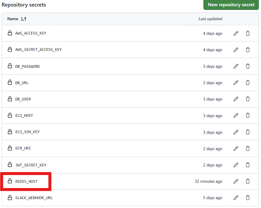 ๊ทธ๋ฆฌ๊ณ REDIS_HOST ํ๊ฒฝ ๋ณ์๋ GitHub Repository Secrets์ ์ ์์ ์ผ๋ก ๋ฑ๋กํ๋ค. ์ด ํ๊ฒฝ ๋ณ์์๋ ElastiCache Redis ์ธ์คํด์ค์ ์๋ํฌ์ธํธ๊ฐ ๋ค์ด๊ฐ๋ค.