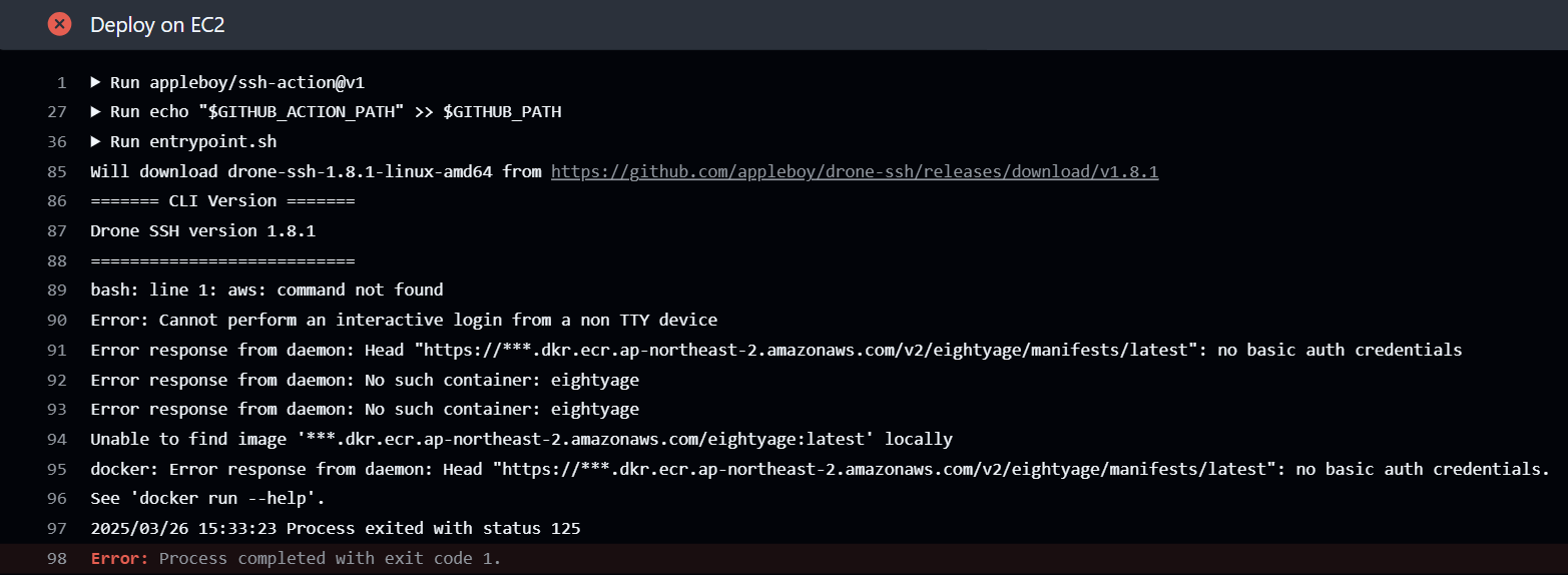 ์์ ๋น์ทํ๊ฒ aws: command not found ์๋ฌ๋ ๋ฐ์ํ๋ค. ์ด ์๋ฌ๋ EC2 ์๋ฒ์ awscli๊ฐ ์์ ์ค์น๋์ด ์์ง ์์์ ๋ฐ์ํ ์๋ฌ๋ก ์ญ์ awscli๋ฅผ ํ ๋ฒ ์ค์นํ๋ฉด ํด๊ฒฐ๋๋ค.