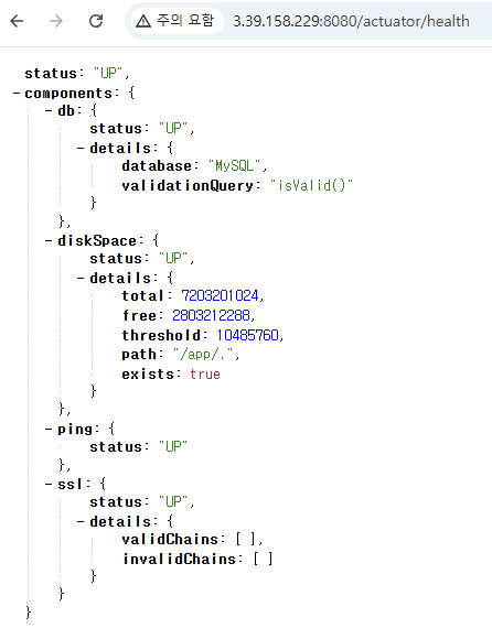 ๋ค์๊ณผ ๊ฐ์ด ์น ๋ธ๋ผ์ฐ์ ๋ฅผ ํตํด์๋ ๋ณผ ์ ์๋๋ฐ, http://<EC2 ํผ๋ธ๋ฆญ IPv4 ์ฃผ์>:8080/actuator/health ์ ๊ฐ์ด ์
