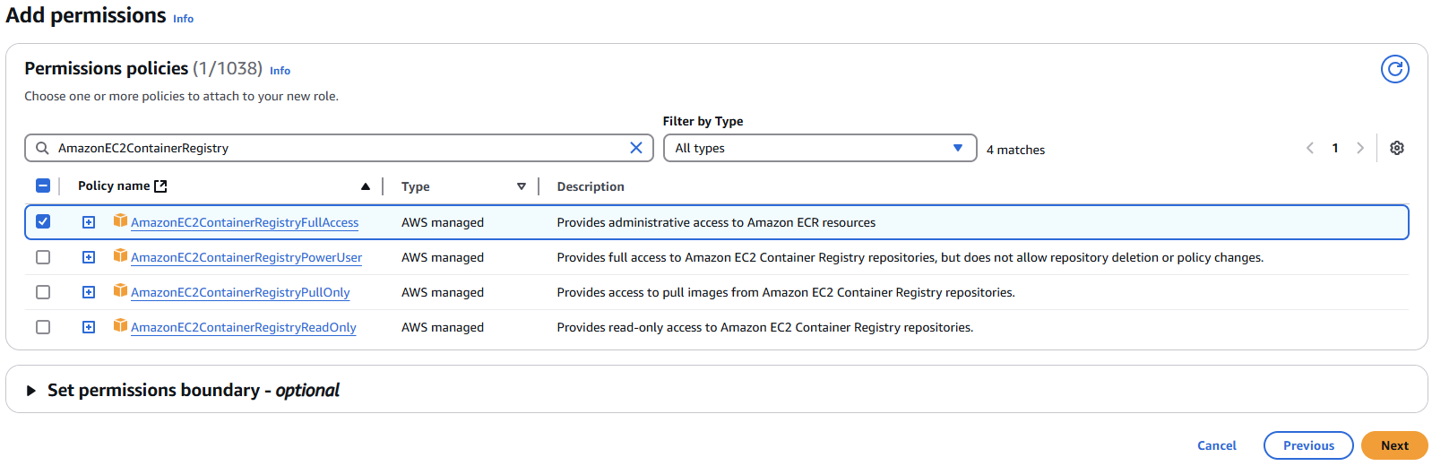 ๋ฐ๋ผ์ IAM ์ญํ ์ EC2๋ก ํด์ ์๋ก ๋ง๋ ํ, AmazonEC2ContainerRegistryFullAccess ๊ถํ์ ํ์ฉํ๋ค. ECR์ Private Registry๋ผ์ IAM ๊ถํ์ด ์์ผ๋ฉด pull์ ์คํจํ๋ค.