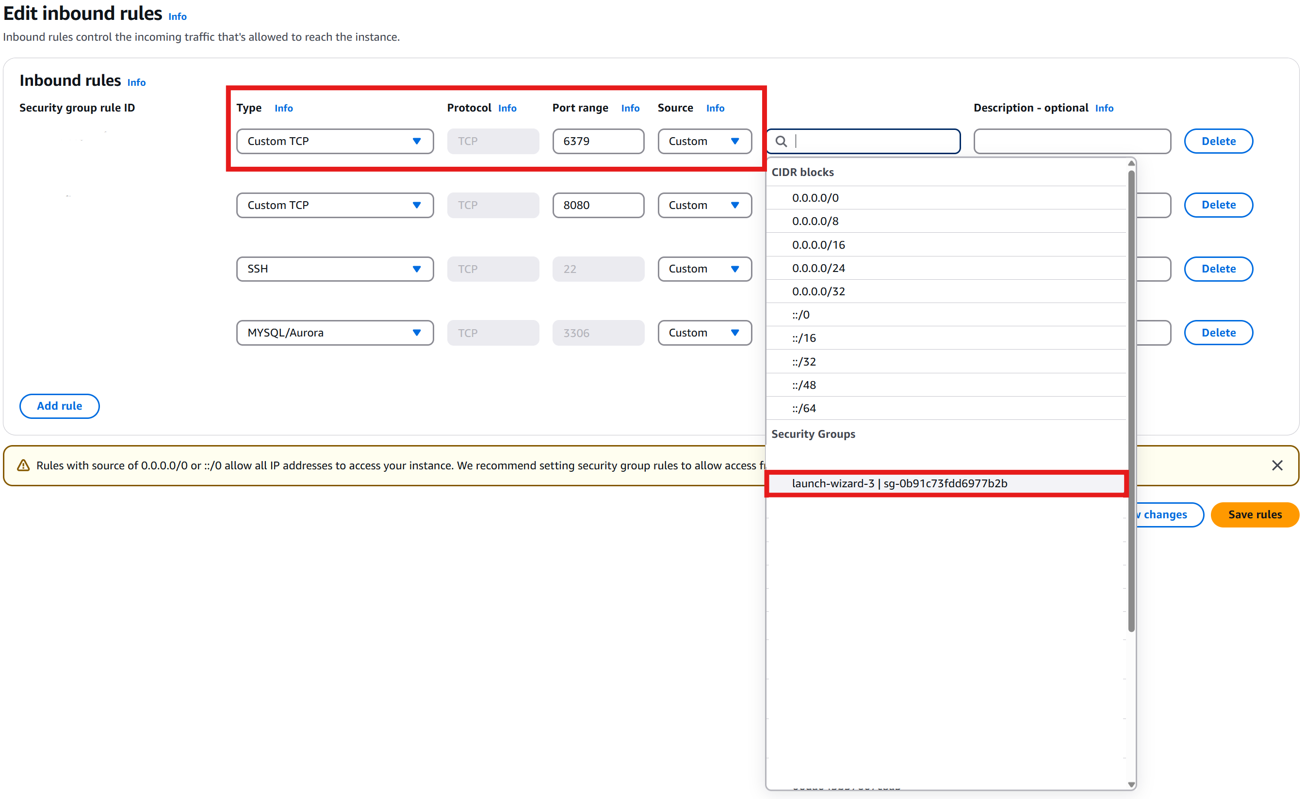 ํด๋น ๋ฌธ์ ๋ ElastiCache Redis ์ธ์คํด์ค์ ๋ณด์ ๊ทธ๋ฃน์ด EC2์ ์ ๊ทผ์ ํ์ฉํ์ง ์์์ ๋ฐ์ํ ๊ฒ์ด์๋ค. Redis๊ฐ ํผ๋ธ๋ฆญํ๊ฒ ์ด๋ฆฌ์ง ์๊ธฐ ๋๋ฌธ์, EC2์ฒ๋ผ ๋ด๋ถ ํต์ ์ ํ๋ ค๋ฉด ๋ณด์ ๊ทธ๋ฃน ๊ฐ ์ธ๋ฐ์ด๋ ํ์ฉ ์ค์ ์ด ํ์๋ค. ๋ค์๊ณผ ๊ฐ์ด ์ธ๋ฐ์ด๋ ๊ท์น์ EC2 ์ธ์คํด์ค์ ๋ณด์ ๊ทธ๋ฃน์ ์์ค๋ก ์ถ๊ฐํด์ค๋ค.