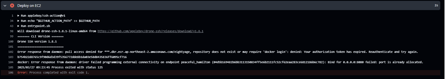 ์ด๋ EC2 ๋ด์์ ํฌํธ 8080์ ์ด๋ฏธ ์ ์ ํ๊ณ ์๋ ์ปจํ ์ด๋๊ฐ ์คํ ์ค์ด๋ผ๋ ๋ป์ด๋ค. ๋๋ถ๋ถ ์ด์ ์ ์คํ๋ ์ปจํ ์ด๋๊ฐ ์ข ๋ฃ๋์ง ์์์ ๋ฐ์ํ๋ ๋ฌธ์ ๋ค.