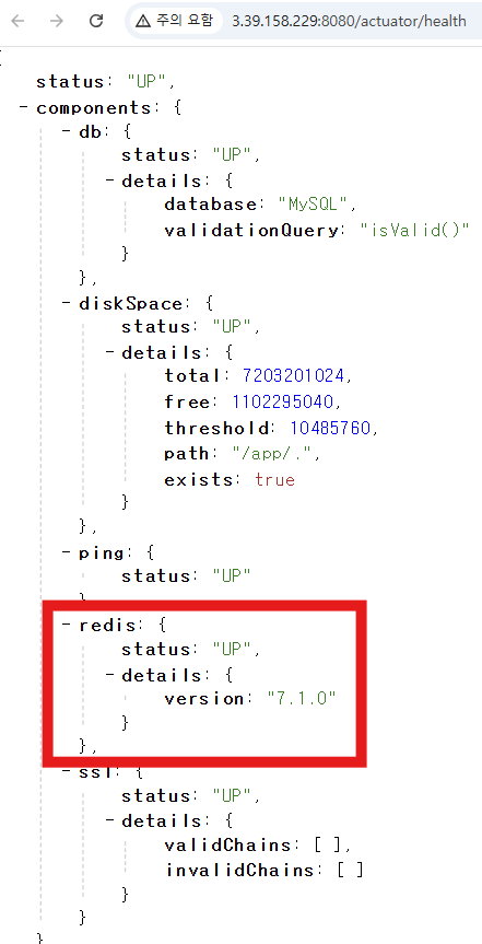 Spring Boot Actuator์์๋ Redis ๊ด๋ จ ํญ๋ชฉ์ด ํฌํจ๋ health ์ ๋ณด๊ฐ ์ ์์ ์ผ๋ก ์ถ๋ ฅ๋์๋ค.