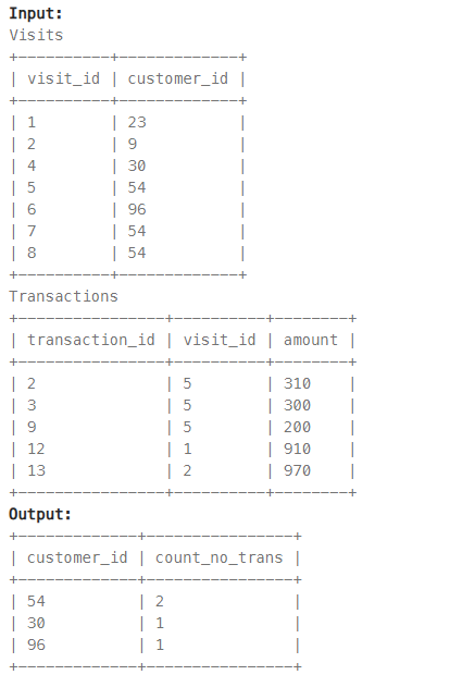 Write a solution to find the IDs of the users who visited without making any transactions and the number of times they made these types of visits.