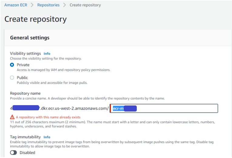 - ECR 콘솔에서, 아래 옵션들을 선택/기입해 주면 간단히 배포된다.