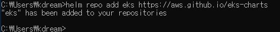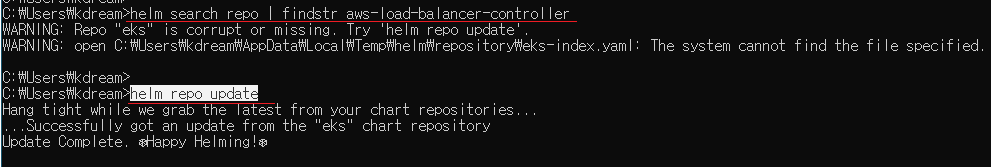※ 위 명령어 실패 시, Helm에 추가한 EKS 차트 레포지토리 확인