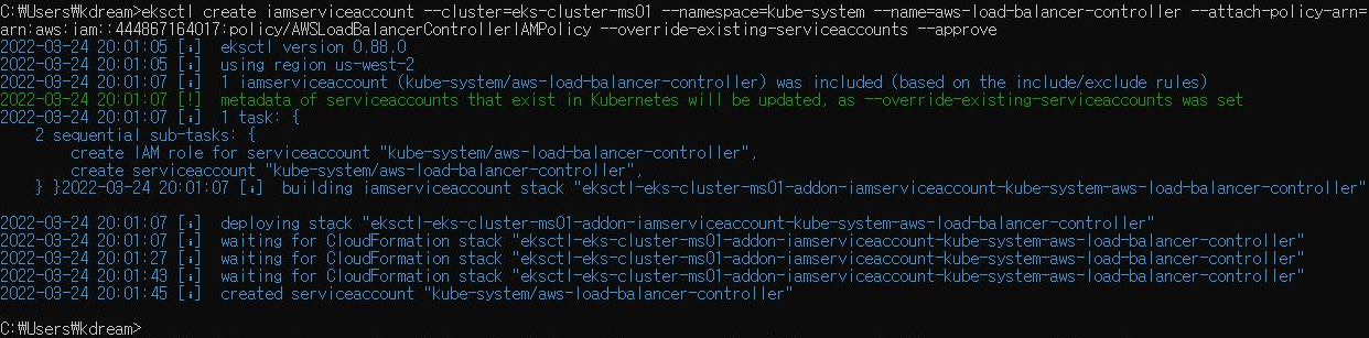 eksctl create iamserviceaccount --cluster=YOUR_CLUSTER_NAME --namespace=kube-system --name=aws-load-balancer-controller --attach-policy-arn=arn:aws:iam::<AWS_ACCOUNT_ID>:policy/AWSLoadBalancerControllerIAMPolicy --override-existing-serviceaccounts --approve