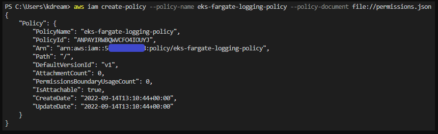 aws iam create-policy --policy-name eks-fargate-logging-policy --policy-document file://permissions.json