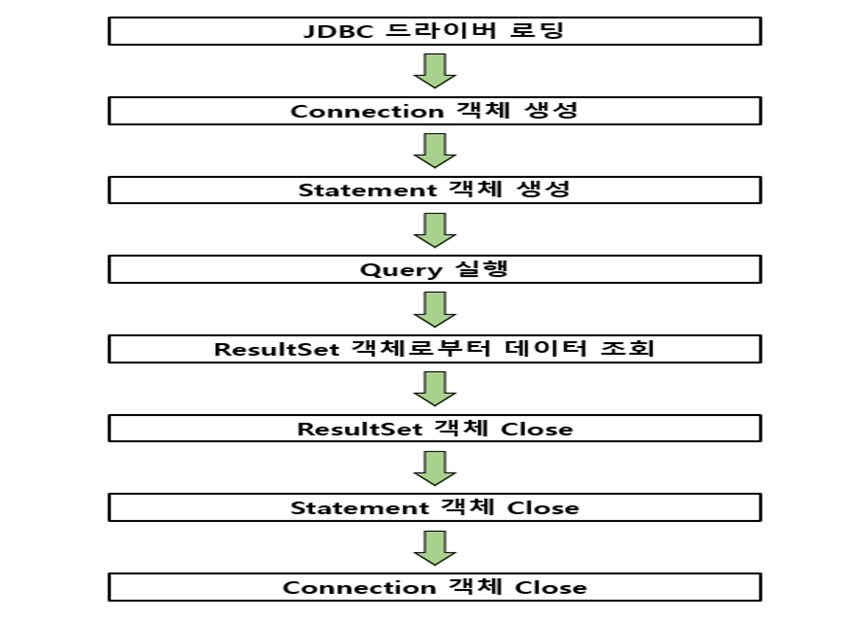 • JDBC API를 통해 사용된 객체들은 생성된 객체들을 사용한 순서의 역순으로 Close 한다.