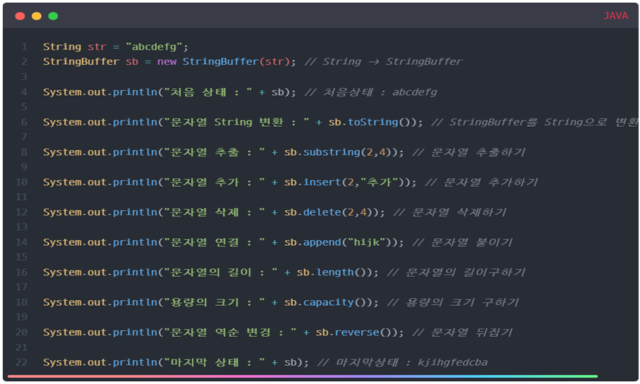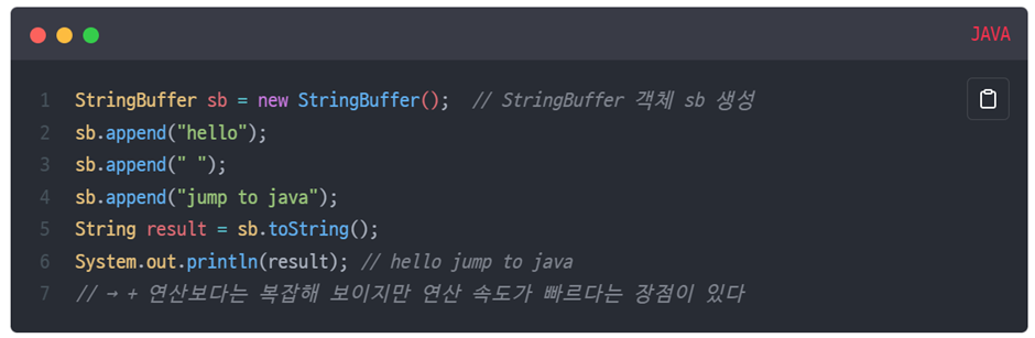 StringBuffer와 비슷한 자료형으로 StringBuilder또한 사용법은 동일하다. 차이점은 StringBuffer는 멀티 스레드 환경에서 안전한 장점이 있고,StringBuilder는 문자열 파싱 성능이 가장 우수하다는 장점이 있다.