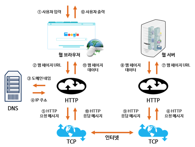 - 주소.com 입력 -> 주소.com을 가지고 있는 네임 서버에 접속 -> IP 주소를 확인 -> IP 주소를 전달 -> IP 주소를 가진 서버로 접속 – 연결된 브라우저로 실행