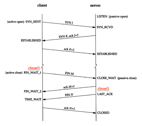 - FIN을 받은 클라이언트는 ACK를 서버에 다시 전송하고 TIME_WAIT으로 상태를 바꾼다.TIME_WAIT에서 일정시간이 지나면 CLOSED 된다. ACK 를 받은 서버도 포트를 CLOSED로 닫는다.