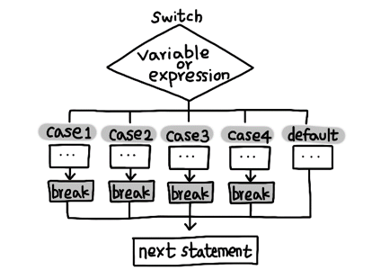 ** break; 를 사용하지 않으면 이후의 명령들도 계속 실행된다.