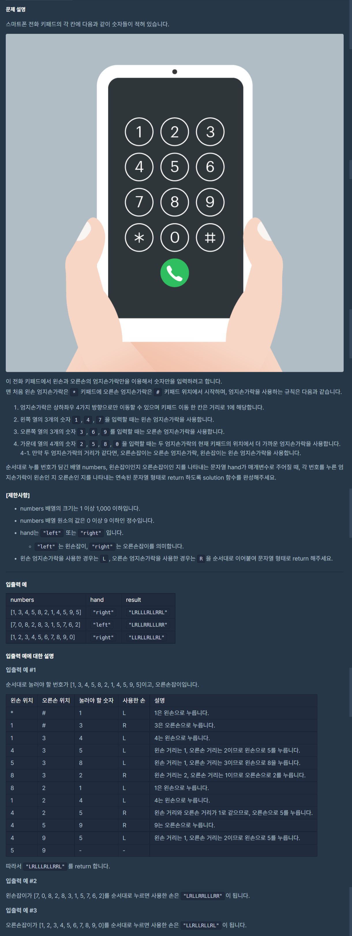 - 거리 계산식 => ( (누를 번호 - 왼손의 위치) / 3 + (누를 번호 - 오른손의 위치) % 3 ) 의 절댓값