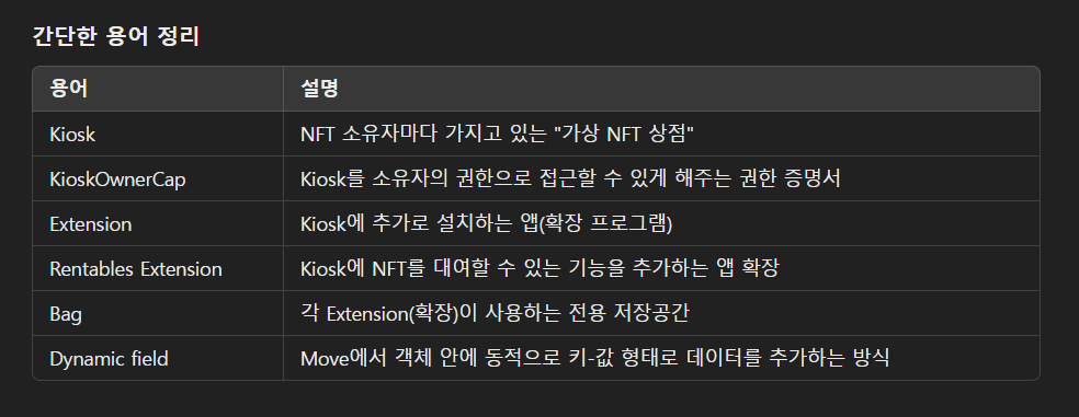 "Kiosk"는 특정 사용자의 NFT를 보관하고 거래할 수 있는 개별적인 스마트 컨트랙트 공간이라고 생각하면 됨!