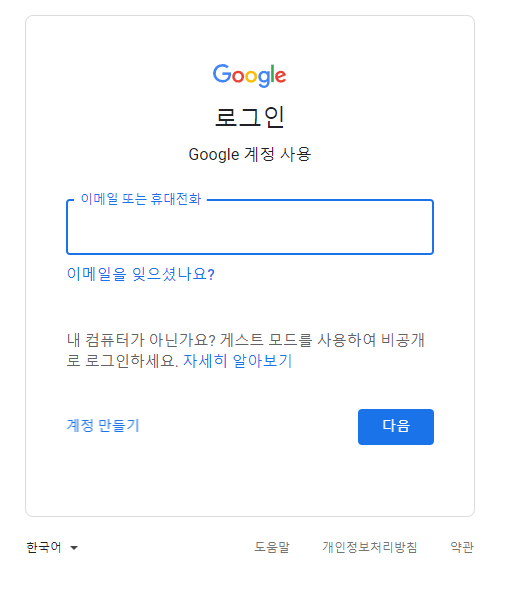 구글은 아이디를 입력하고 다음을 눌러야 비밀번호를 입력할 수 있다. 아주아주아주 귀찮다!!!!