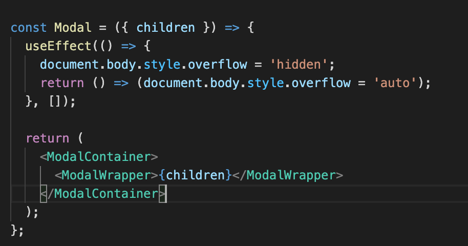 또한 모달창이 켜졌을 때 스크롤 방지를 위해서 useEffect를 써주었는데 모달창이 켜졌을 때 (componentDidMount()) overflow = 'hidden'을 통해서 스크롤을 멈추게하고 다시 모달창이 꺼질 때(componentWillUnmount()) 스크롤이 작동하도록 overflow = auto를 적용해줬다.