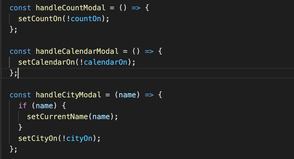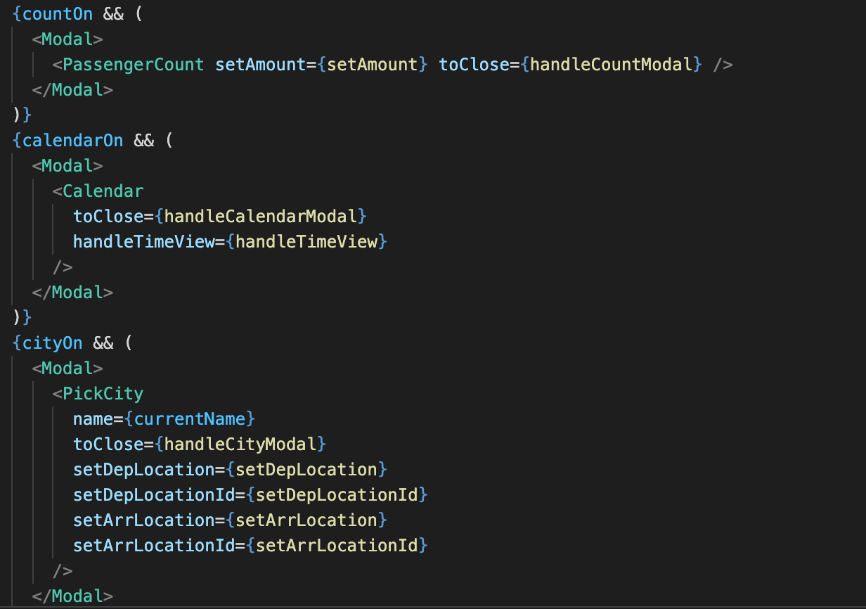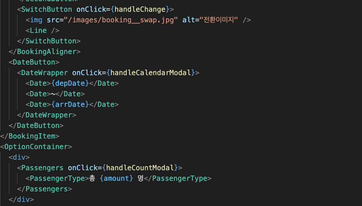 이렇게 완성한 모달창을 children을 통해서 안에 내용만 calendar, pickCity,passengerCount 등 내용만 바뀌도록 해주었다.