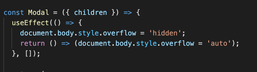 모달창을 열었을 때는 뒤에 화면이 스크롤이 되지않다가 모달창을 닫았을 때는 다시 화면이 스크롤이 작동하도록 하기위해서 useEffect를 사용해주었다.
