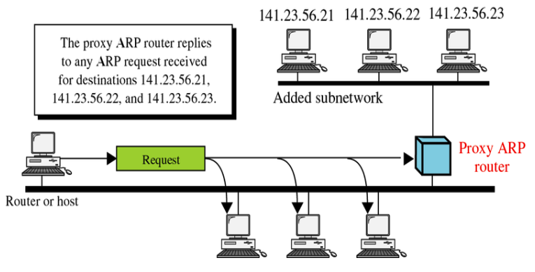 ARP는 앞선 설명처럼 같은 네트워크 안에서 통신하기 위해 주소를 요청하는 방식으로, 다른 네트워크로는 ARP 요청이 가지 못한다. 때문에, 다른 네트워크로 패킷을 보내고자 한다면 ARP 요청을 최소 2번 이상 거쳐야 한다. 그렇지만, Proxy ARP를 사용한다면 다른 네트워크에 접속된 Router가 이미 host의 MAC 주소를 알고 있기 때문에 자신이 Destination인 척(Proxy) 자신의 MAC 주소를 Sender에게 전달하는 방식이다. 예를 들어, 위의 그림처럼 하나의 네트워크가 여러 개로 Subnetting된 네트워크에서 Sender가 다른 서브넷으로 패킷을 보내고자 할 때 ARP Request를 보낸다면, Subnetting된 네트워크를 관리하는 Proxy ARP Router가 해당 Request를 받아 자신의 MAC 주소를 Sender에게 보내준다. 이후, 이 Router는 자신의 서브넷에 있는 host의 MAC 주소를 알고 있으니 그 host에게 패킷을 최종적으로 전달하게 된다.