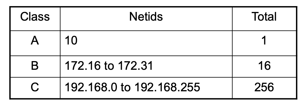 클래스 A는 Netid의 수가 적고, Hostid의 수가 훨씬 크기 때문에(2^7 << 2^24) IP 주소를 많이 사용하는 대기업에 할당된다. 통신사를 예를 들면 그 통신사에 가입한 사람들이 많을테니까 hostid가 많은 Class A를 사용한다.