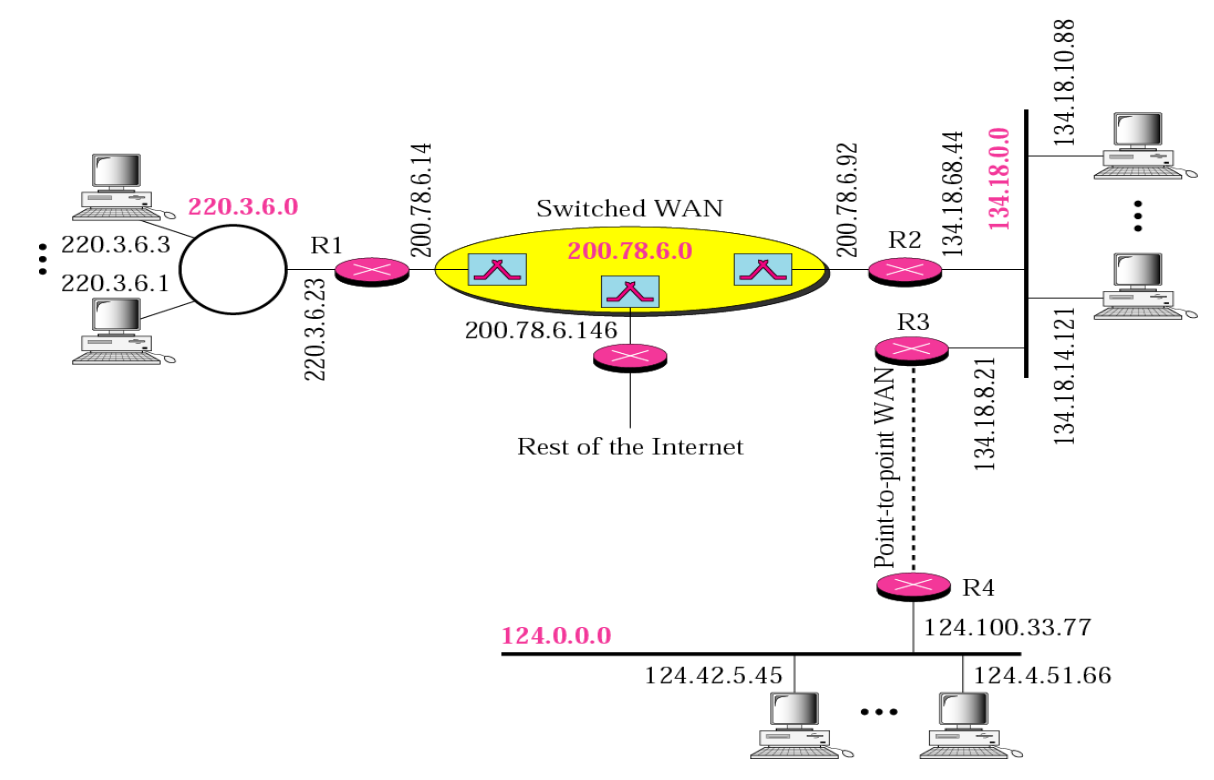위의 그림에서는 네트워크가 총 5개이다. Bus, Point-to-Point 등 여러 형태의 네트워크가 존재하고 있고, 이 네트워크들을 Router들이 연결하고 있는 WAN의 구조이다. 이렇게 네트워크가 여러 개 있으므로 각각의 네트워크마다 서로 다른 Netid로 할당해야 한다. 그 이후에는 그 네트워크에 접속되어 있는 호스트들에게 각각 hostid를 할당해 줘야 한다.